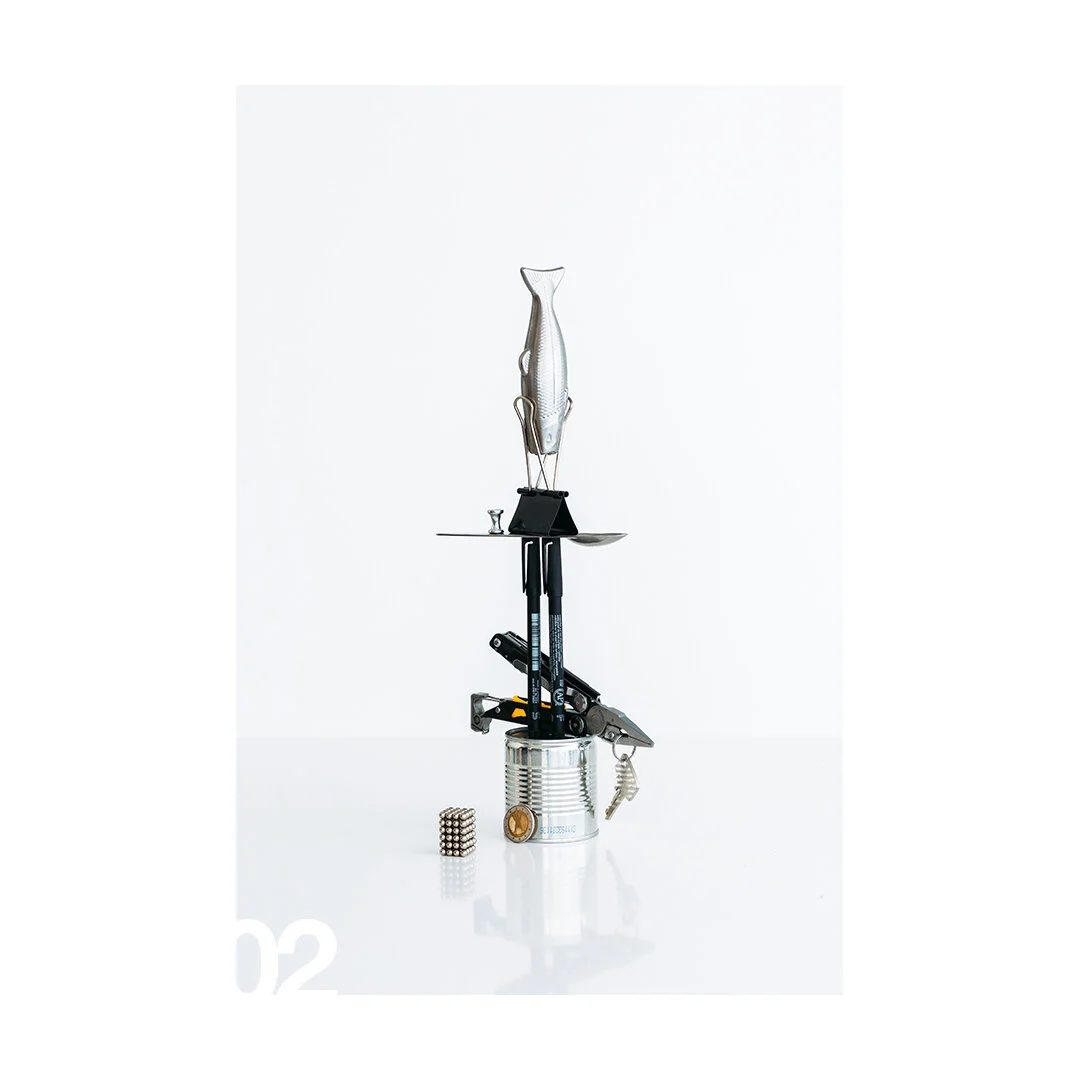 stainless steel soap \ foldback clip \ ice cream spoon \ magnet \ 2 permanent pens \ multitool \ can of beans \ key \ 2 euro \ 96 magnet balls